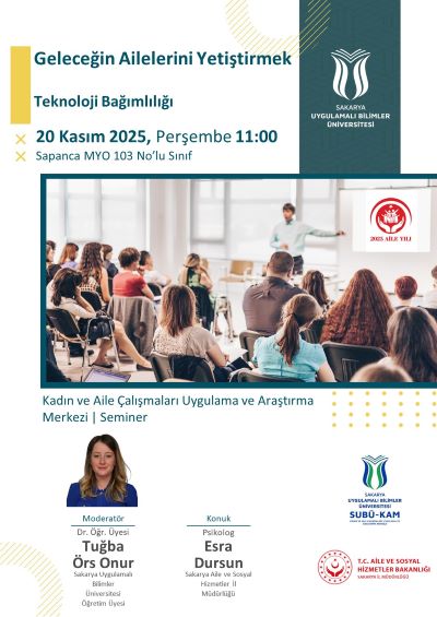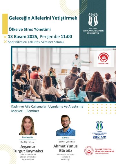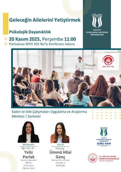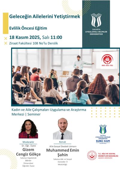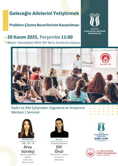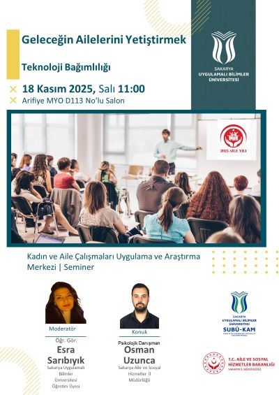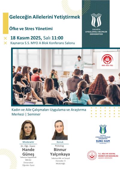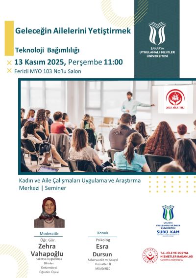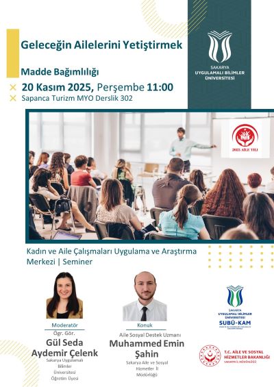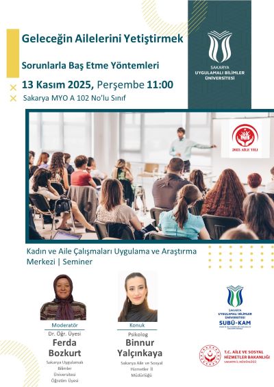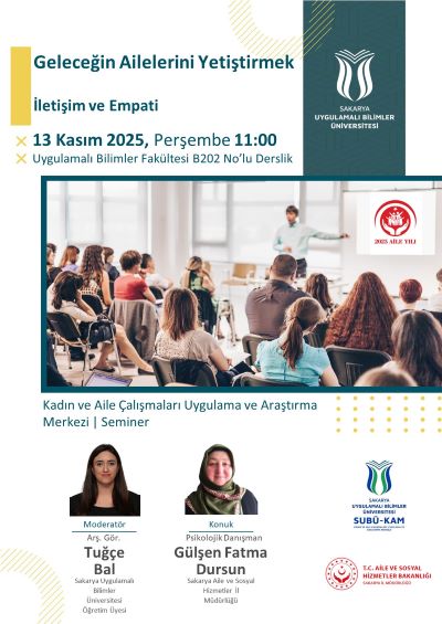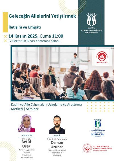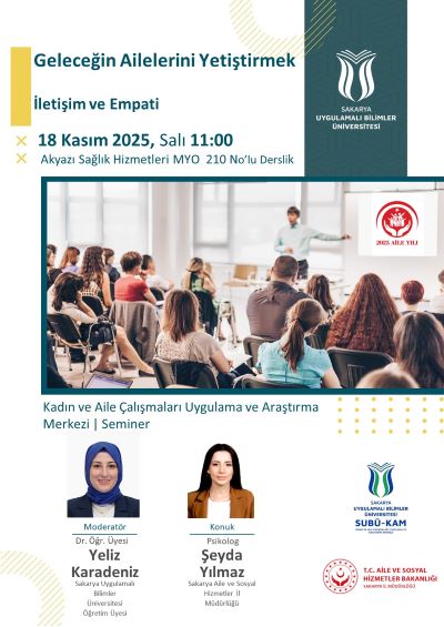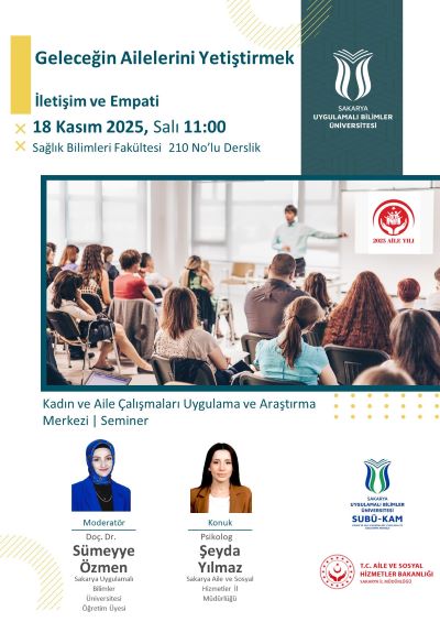 SUBÜKAM ve Sakarya Aile ve Sosyal Hizmetler iş birliği ile 6 Fakülte ve 12 Meslek Yüksekokulumuzdaki öğrencilerimiz için 2025 Aile Yılı kapsamında “Geleceğin Ailelerini Yetiştirmek” temasına uygun eğitim seminerlerimiz başlıyor.