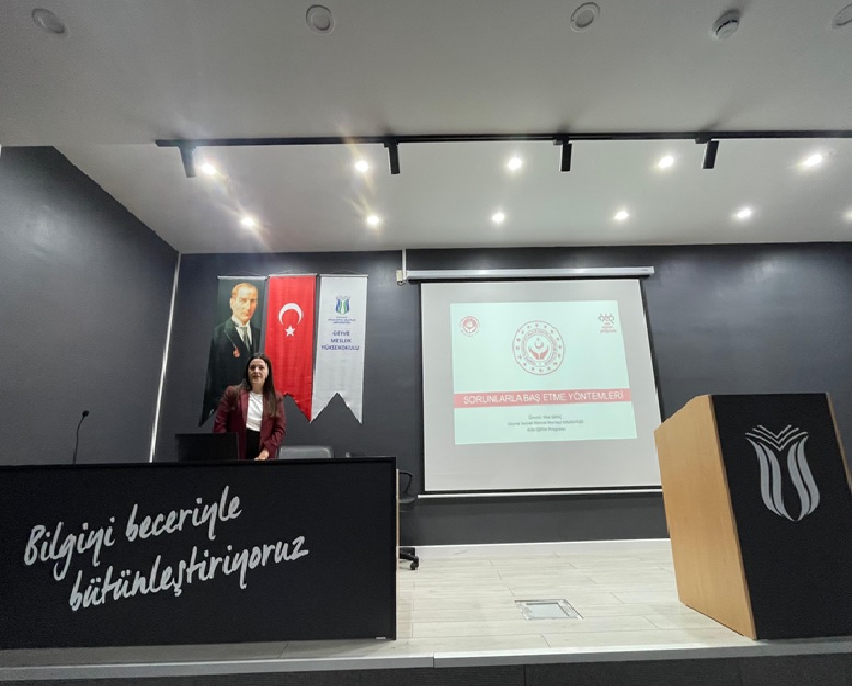 Eğitim semineri öncesinde SUBÜKAM birim temsilcimiz Öğr. Gör. Afet IRMAK tarafından merkezimizi tanıtıcı kısa bir sunum yapıldı. Sonrasında, Sakarya Aile ve Sosyal Hizmetler İl Müdürlüğü’nden Psikolog Ümmü Hilal GENÇ tarafından gerçekleştirilen eğitim seminerinde, “Sorunlarla Baş etme Yöntemi” konusuna ilişkin değerli bilgiler paylaşıldı. Seminer, konuşmacı ile aktif bir etkileşim içinde tamamlandı.