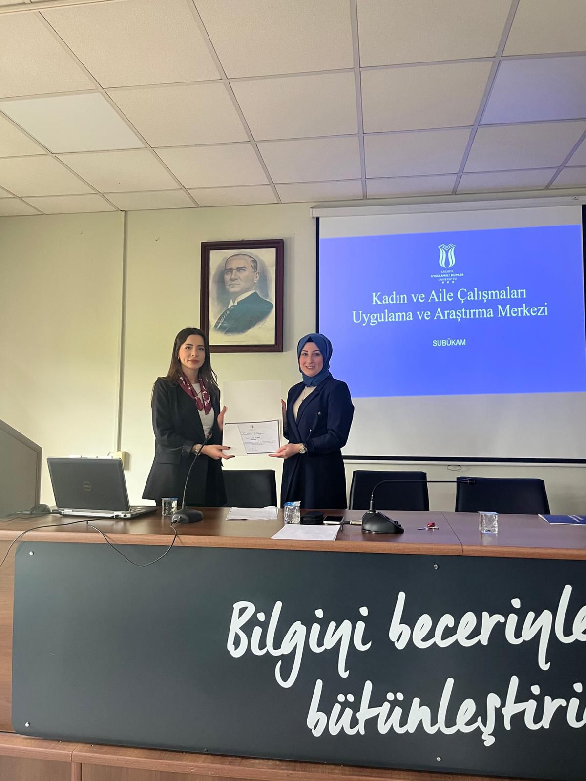 Etkinlik sonunda, katkılarından dolayı Psikolog Şeyma YILMAZ’a SUBÜKAM birim temsilcimiz Dr. Öğr. Üyesi Yeliz KARADENİZ tarafından teşekkür belgesi takdim edildi.