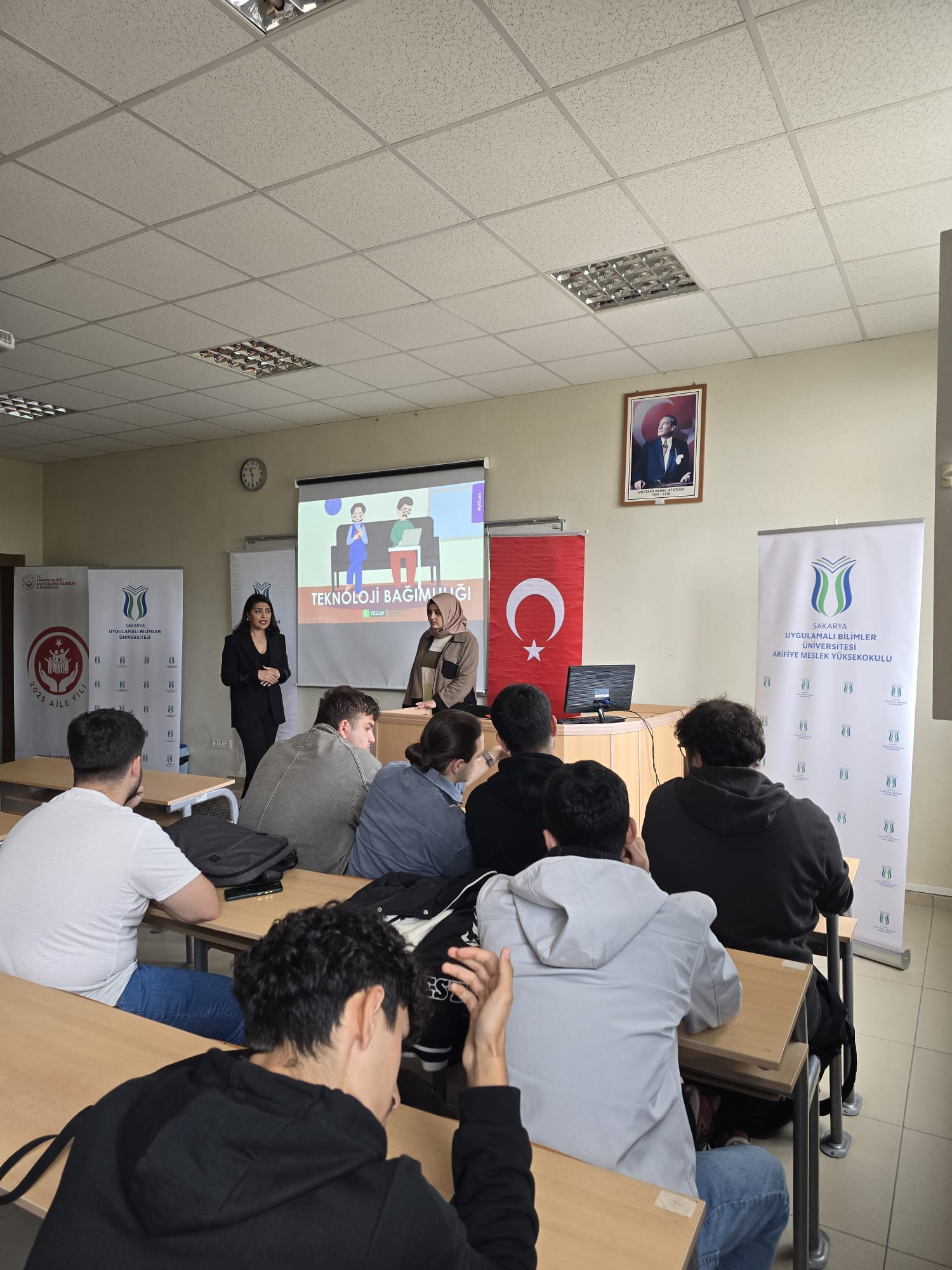 Eğitim semineri öncesinde SUBÜKAM birim temsilcimiz Öğr. Gör. Esra SARIBIYIK tarafından merkezimizi tanıtıcı kısa bir sunum yapıldı. Sonrasında, Sakarya Aile ve Sosyal Hizmetler İl Müdürlüğü’nden Psikolog Esra DURSUN tarafından gerçekleştirilen eğitim seminerinde, “Teknoloji Bağımlılığı” konusuna ilişkin değerli bilgiler paylaşıldı. Seminer, konuşmacı ile aktif bir etkileşim içinde tamamlandı.