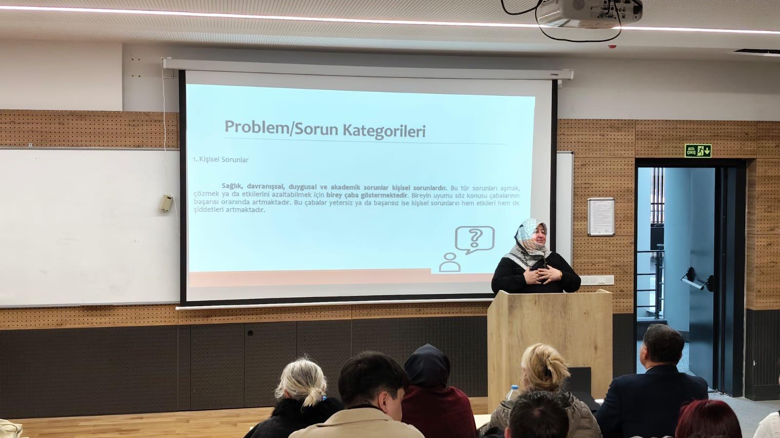 Eğitim semineri öncesinde Hendek MYO Müdür Yardımcısı ve SUBÜKAM birim temsilcimiz Öğr. Gör. Ümmehan Erdil ŞAHİN’in tarafından merkezimizi tanıtıcı kısa bir sunum yapıldı. Sonrasında, Sakarya Aile ve Sosyal Hizmetler İl Müdürlüğü Hendek Sosyal Hizmet Merkezi Müdürü ve Psikolojik Danışman Sayın Gülşen Fatma DURSUN’tarafından gerçekleştirilen eğitim seminerinde, “Sorunlarla Baş etme Yöntemi” konusuna ilişkin değerli bilgiler paylaşıldı.