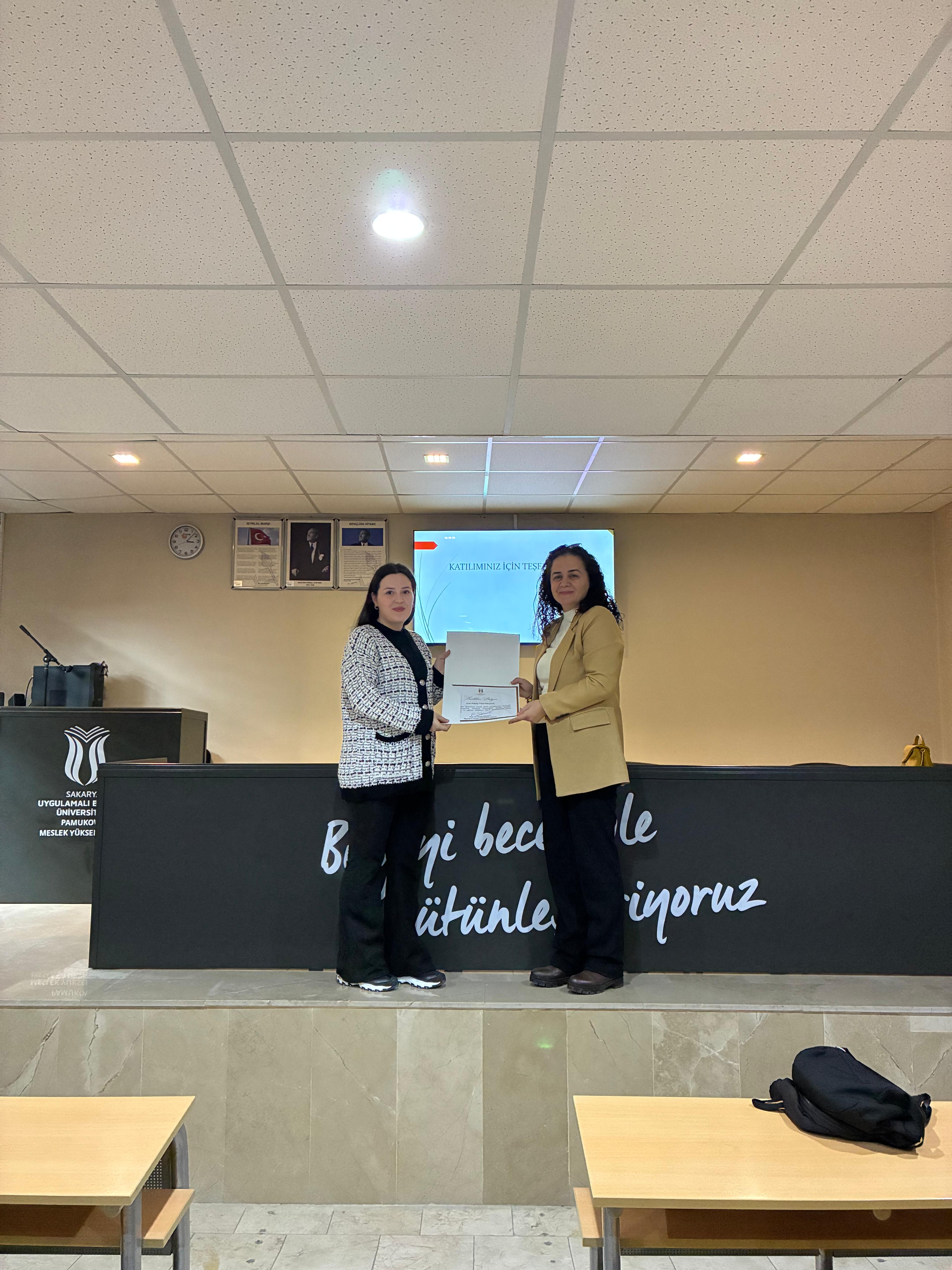 Etkinlik sonunda, katkılarından dolayı Psikolog Ümmü Hilal GENÇ’e Pamukova MYO Müdür Yardımcısı ve SUBÜKAM birim temsilcimiz Öğr. Gör Dr. Yeliz PARLAK tarafından teşekkür belgesi takdim edildi.