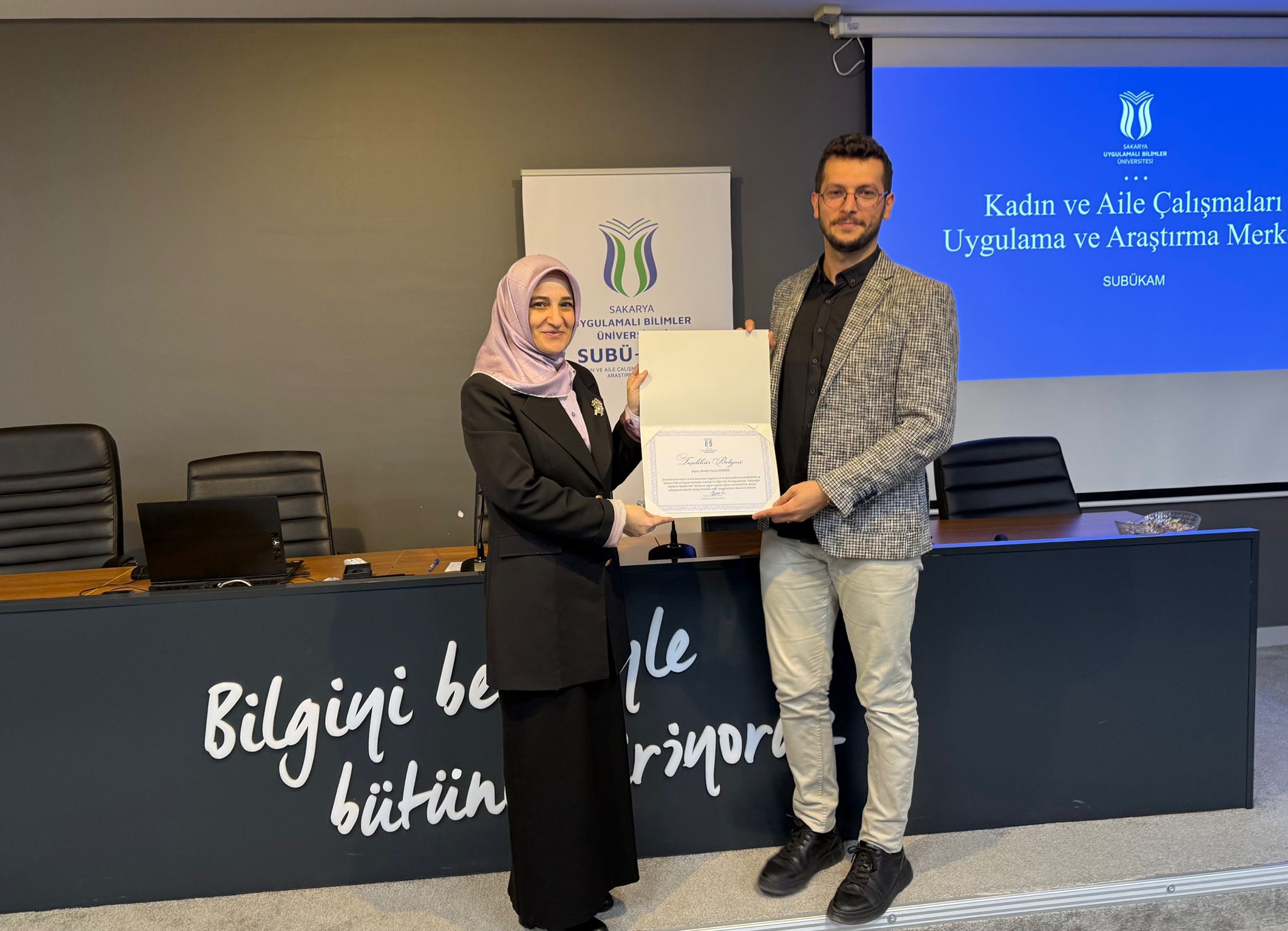 Etkinliğin sonunda, katkılarından dolayı Sosyal Çalışmacı Ahmet Yunus Gürbüz’e teşekkür belgesi SUBÜKAM Merkez Müdürü Prof. Dr. Betül Usta tarafından takdim edildi.