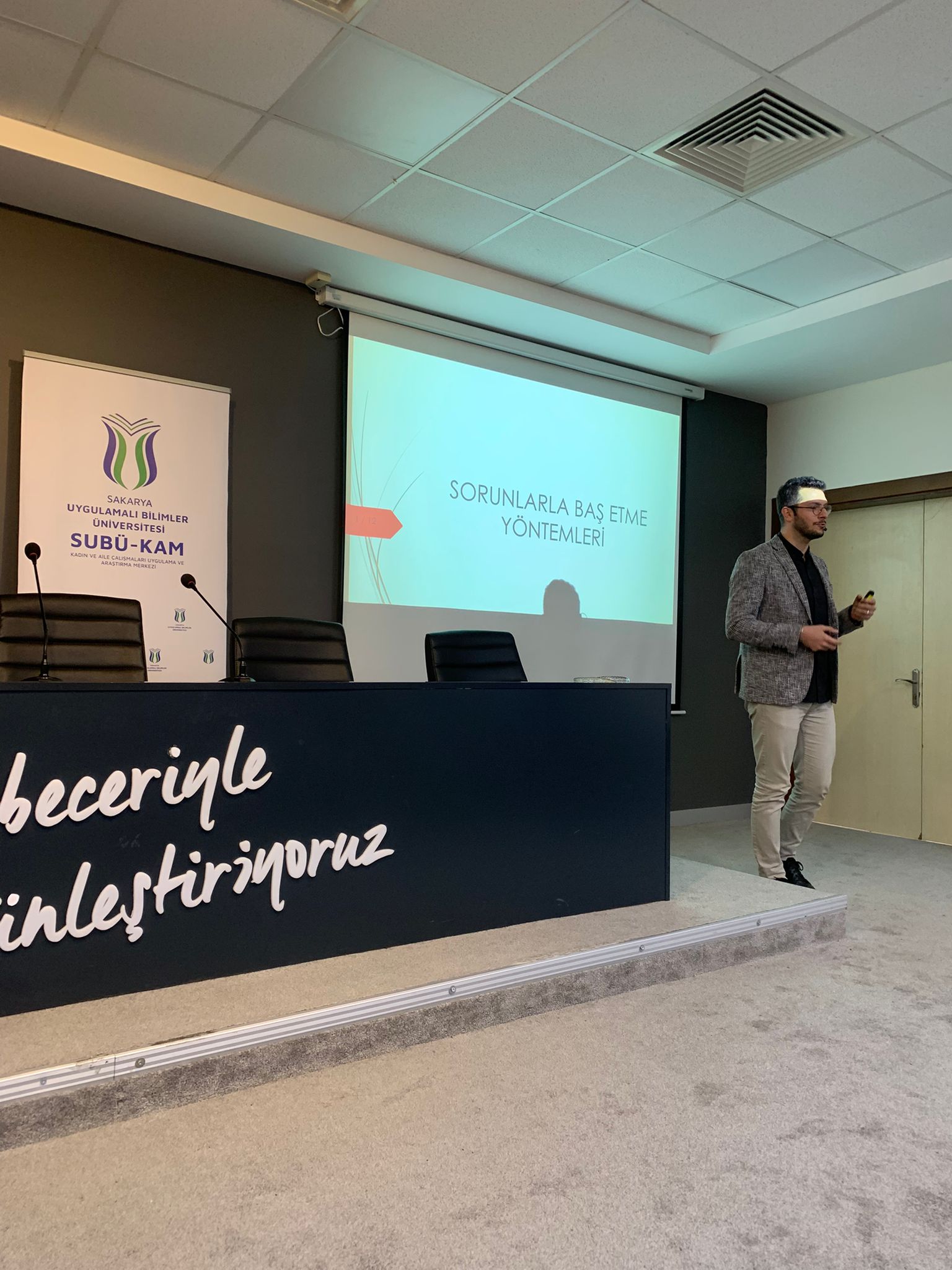 Programda, Sakarya Aile ve Sosyal Hizmetler İl Müdürlüğünden Sosyal Çalışmacı Ahmet Yunus Gürbüz tarafından “Sorunlarla Baş Etme Yöntemleri” başlıklı seminer verildi. Gürbüz, “sorun” kavramını günlük akışa aykırı olan ve kişiyi çözüm arayışına yönlendiren durumlar olarak tanımladı. Sorunların analiz, planlama, yaratıcılık ve çaba gerektirdiğini; etkili bir çözüm için ise problemin kök nedeninin doğru tespit edilmesinin önem taşıdığını ifade etti. Öğrenciler ve öğretim üyeleri seminer boyunca konuşmacı ile aktif bir etkileşim içinde bulundu.