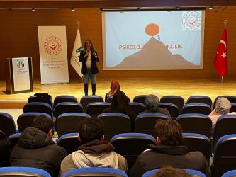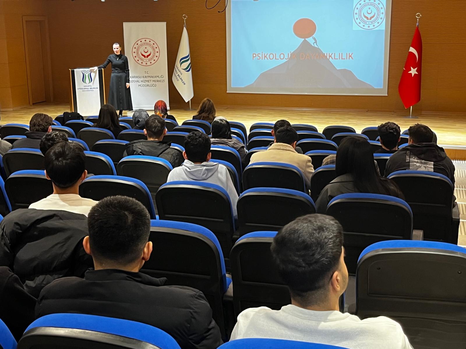 Etkinlik öncesinde SUBÜKAM birim temsilcisi Dr. Öğr. Üyesi Pınar Köç Bakacak tarafından merkezin faaliyetlerine ilişkin kısa bir tanıtım sunumu yapıldı. Ardından Sosyal Çalışmacı Elif Önal tarafından verilen “Psikolojik Dayanıklılık” başlıklı seminerde; bireyler arası ilişkilerin önemi, duyguların doğru ifade edilmesi ve psikolojik dayanıklılığın geliştirilmesi konularında bilgilendirici paylaşımlarda bulunuldu. Seminer, öğrencilerin aile içi iletişim becerilerini güçlendirmelerine ve sosyal ilişkilerinde daha sağlıklı tutumlar geliştirmelerine önemli katkılar sundu.
