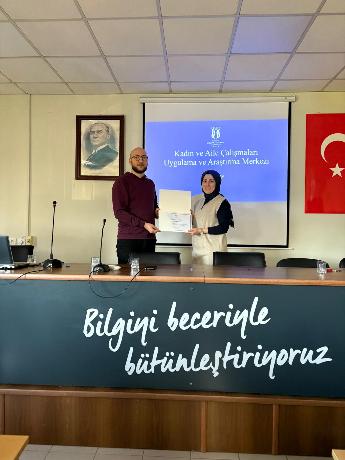Etkinlik sonunda, katkılarından dolayı Aile Sosyal Destek Uzmanı Muhammed Emin Şahin’e birim temsilcimiz Dr. Öğr. Üyesi Yeliz Karadeniz tarafından teşekkür belgesi takdim edildi.