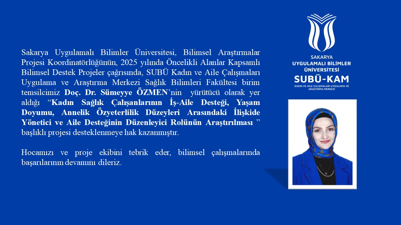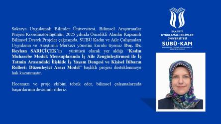 * SUBÜ Kadın ve Aile Çalışmaları Uygulama ve Araştırma Merkezi yönetim kurulu üyemiz Doç. Dr. Reyhan SARIÇİÇEK’in yürütücü olarak yer aldığı “Kadın Muhasebe Meslek Mensuplarında İş Aile Zenginleştirmesi ile İş Tatmin Arasındaki İlişkide İş Yaşam Dengesi ve Kişisel İtibarın Rolleri: Düzenleyici Aracı Model” başlıklı projesi ile